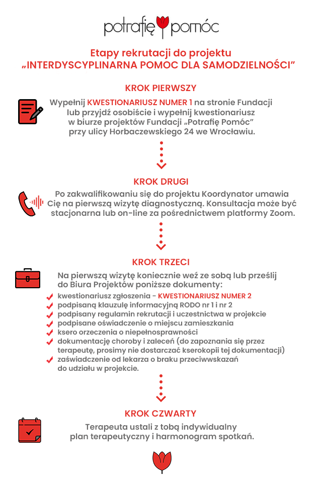 Informacje dotyczące procesu zgłoszeniowego - rekrutacja krok po kroku - prezentuje infografika. Wszelkie potrzebne dokumenty są do pobrania na stronie: Interdyscyplinarna pomoc dla samodzielności (potrafiepomoc.org.pl)