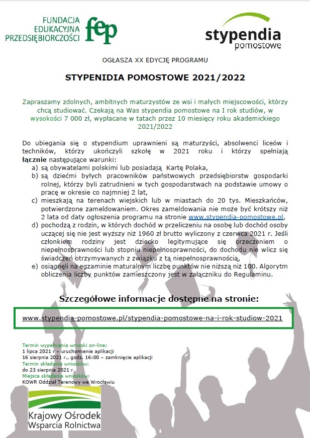 Stypendia pomostowe 2021/2022 Wydrukuj stronę Źródło obrazu okładkowego: Depositphotos Pliki do pobrania Krajowy Ośrodek Wsparcia Rolnictwa - PISMO Regulamin przyznawania i przekazywania stypendium dla studentów