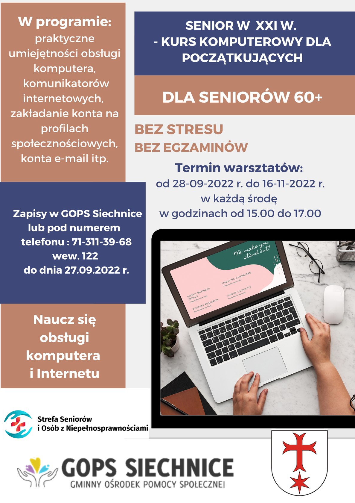 Gminny Ośrodek Pomocy Społecznej w Siechnicach w ramach realizacji projektu Strefa Seniorów i Osób z Niepełnosprawnością finansowanego ze środków Gminy Siechnice, organizować będzie bezpłatne zajęcia komputerowe pt. "Senior w XXI wieku - kurs komputerowy od podstaw".