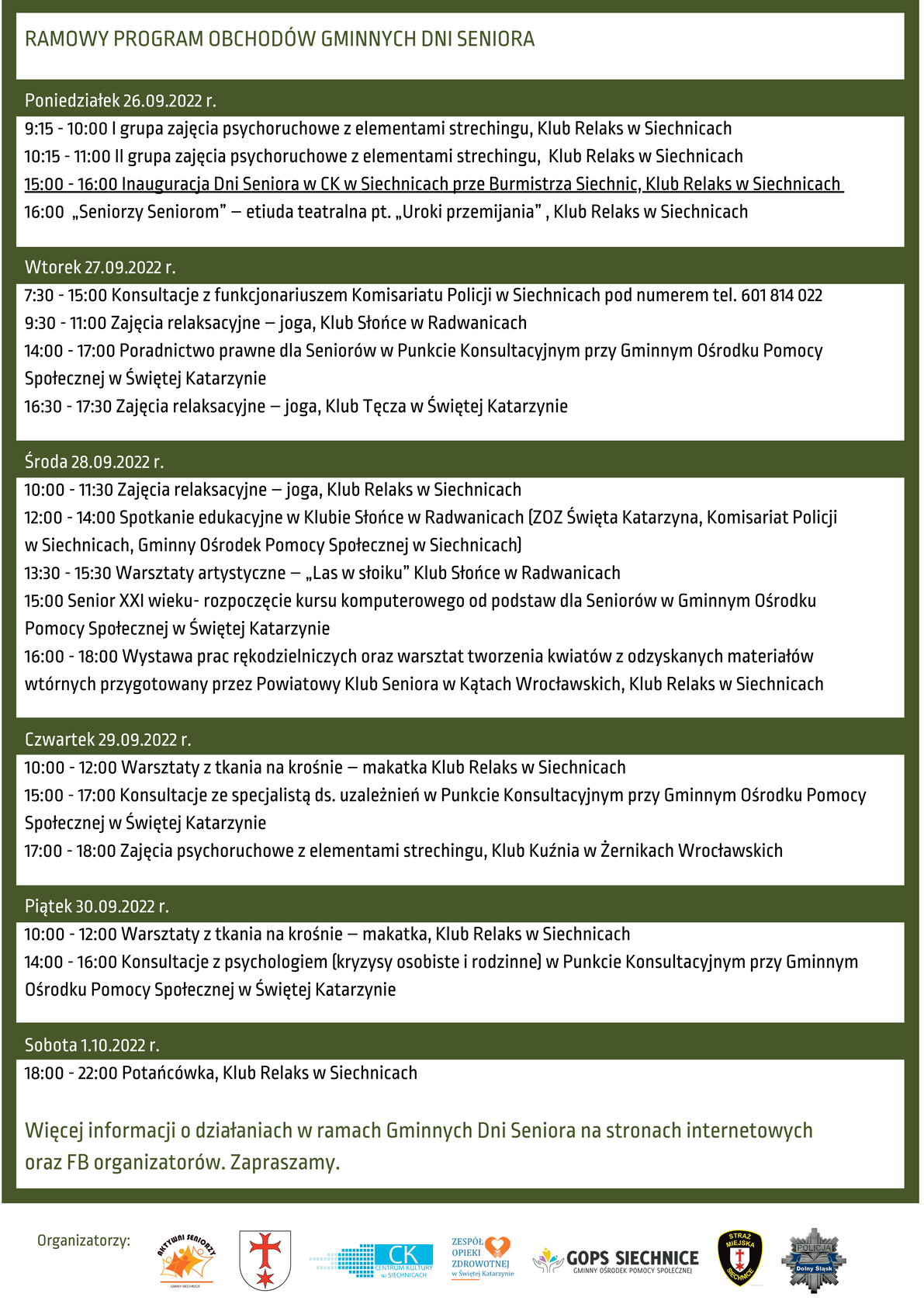 Działania Gminnego Ośrodka Pomocy Społecznej w Siechnicach w ramach Gminnych Dni Seniora 2022 w dniach 26.09-1.10.2022 r.