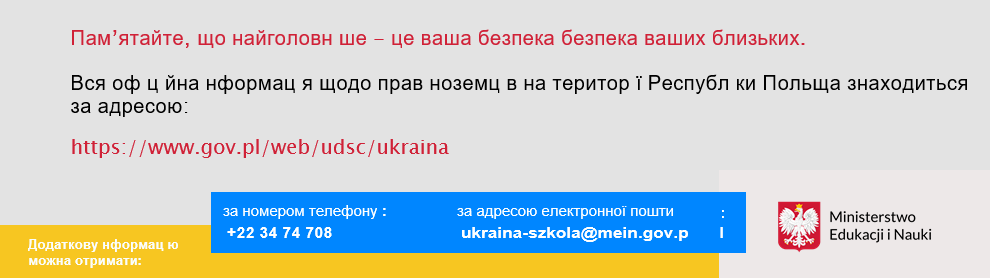 • Навчання дıтей ı молод у вıцı 7-18 рокıв у державних школах безкоштовне. Незнання дитиною польської мови не є перешкодою для прийняття до школи.