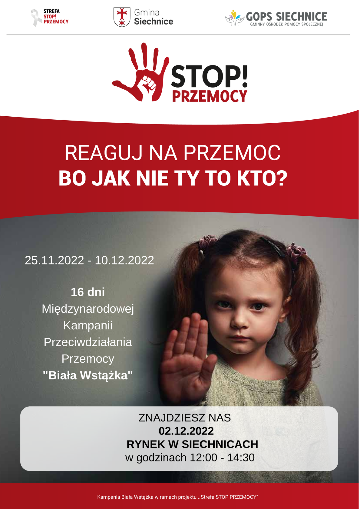 W dniu 2 grudnia 2022 r. (od 12:00 do 14:30) na placu przy Urzędzie Miejskim w Siechnicach otwarty zostanie Punkt Informacyjny, w którym będzie można zdobyć informacje na temat radzenia sobie w sytuacji doświadczania przemocy oraz poznać formy pomocy oferowane na terenie naszej Gminy.