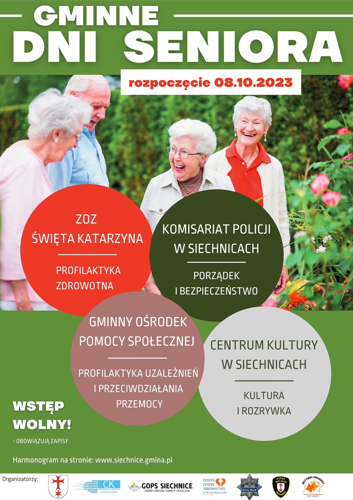 W ramach opracowanej Strategii Wsparcia Osób Starszych i Niepełnosprawnych w Gminie Siechnice na lata 2021-2027 już po raz trzeci będą obchodzone Gminne Dni Seniora. W tym czasie wszystkie służby naszej gminy działające na rzecz tej grupy mieszkańców tj. policja, ochrona zdrowia, kultura i pomoc społeczna, otwierają swoje drzwi dla Seniorów, ale też docierają z działaniami do środowiska zamieszkania najstarszych mieszkańców naszej społeczności - Gminy Siechnice. Wzorem lat poprzednich, również w tym roku w zaplanowano szereg działań, na które chcielibyśmy serdecznie zaprosić.
