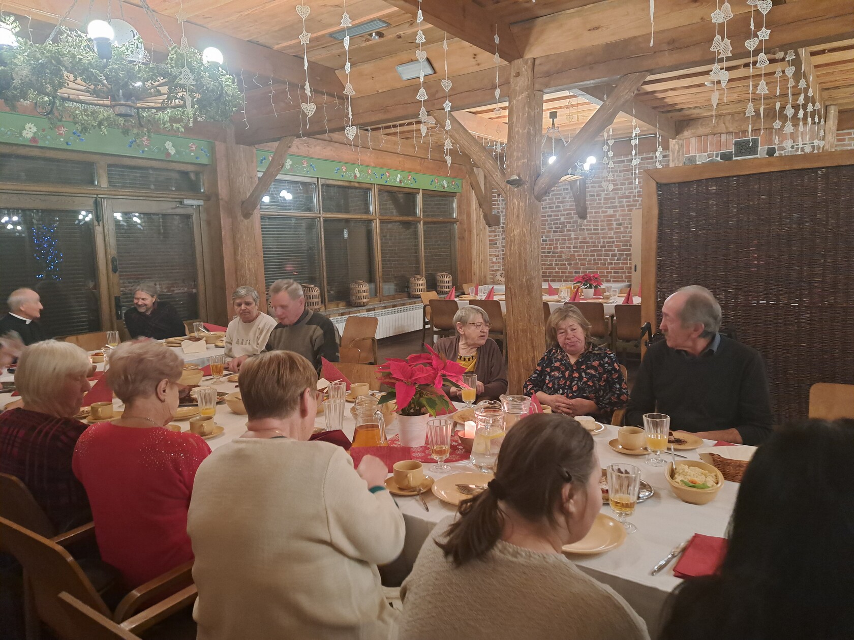 Dnia 14 grudnia 2023 r. w Karczmie „Katarzyna” w Świętej Katarzynie odbyło się Spotkanie Wigilijne dla osób korzystających ze wsparcia i pomocy Gminnego Ośrodka Pomocy Społecznej w Siechnicach. W spotkaniu wzięło w udział blisko 30 osób – zarówno seniorów, osób objętych usług opiekuńczych, jaki i tych korzystających z pomocy materialnej, opieki wytchnieniowej oraz asystentury dla osób z niepełnosprawnościami.