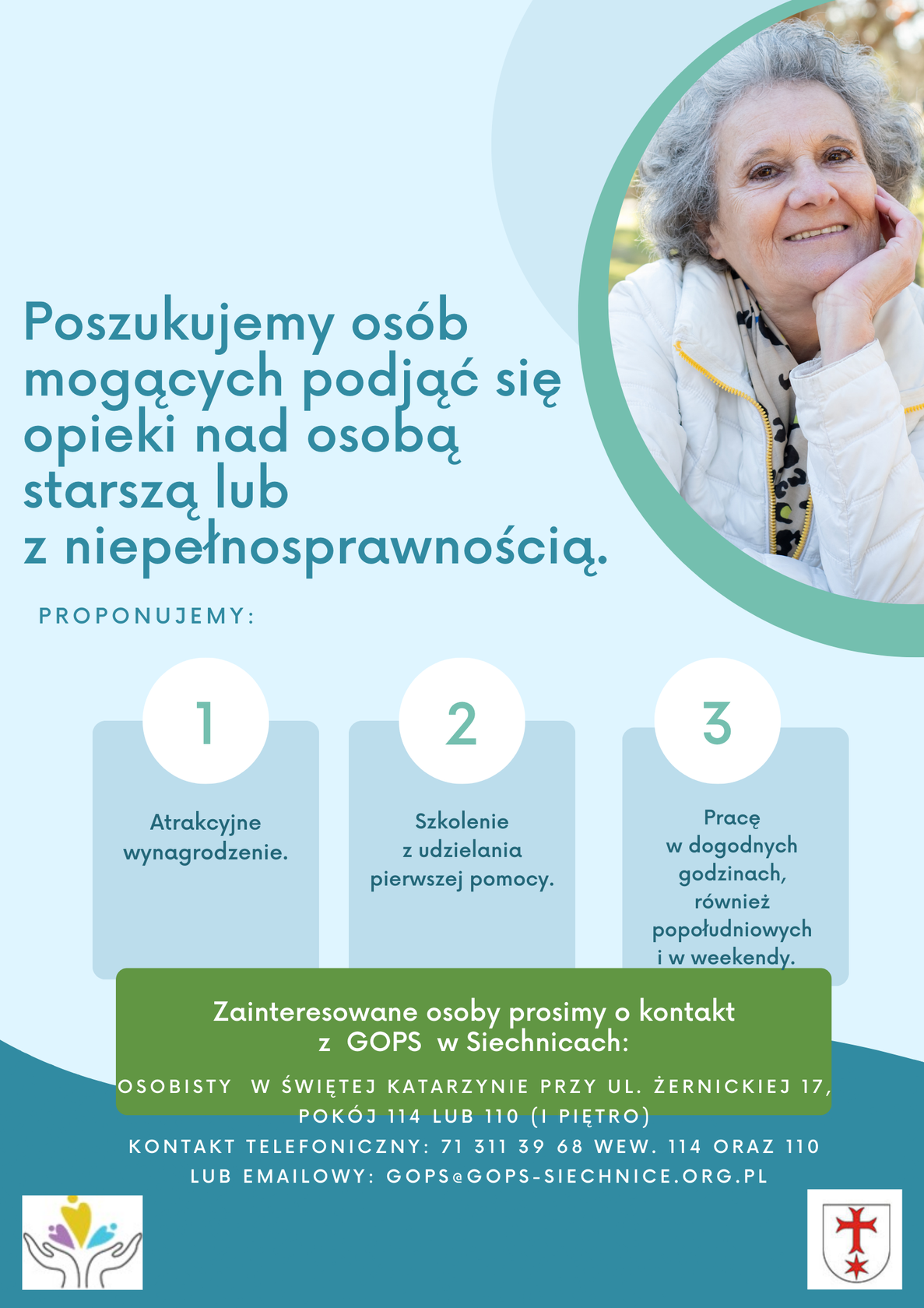 Osoby chętne do pracy w charakterze opiekuna osób starszych lub niepełnosprawnych mogą zgłaszać swoją kandydaturę, a także uzyskać więcej informacji w Gminnym Ośrodku Pomocy Społecznej w Siechnicach, ul. Żernicka 17, 55-010 Święta Katarzyna. tel. 77 311 39 68 wew. 110 lub 114.