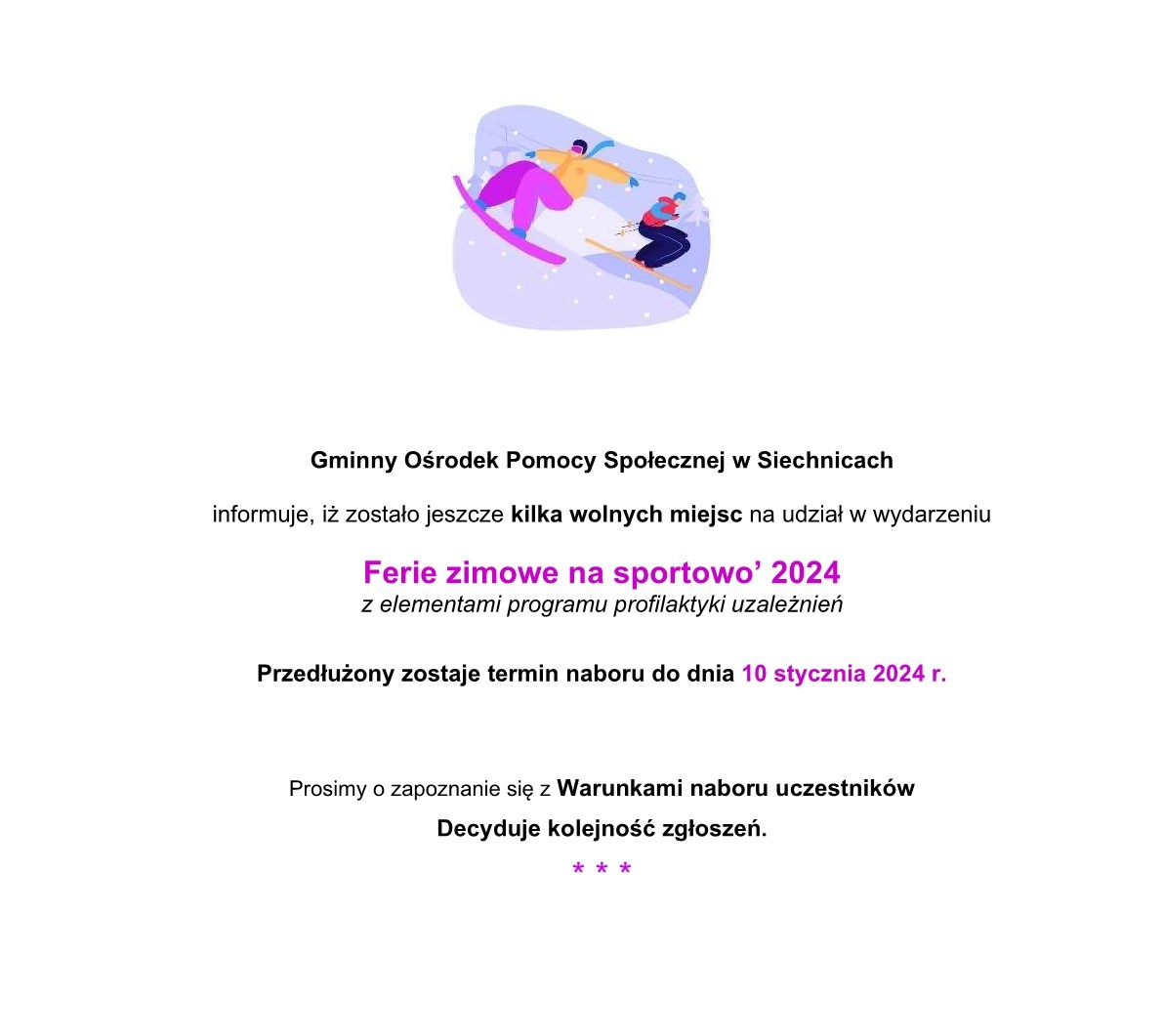 Przedłużenie terminu składania wniosków na Ferie zimowe na sportowo '2024