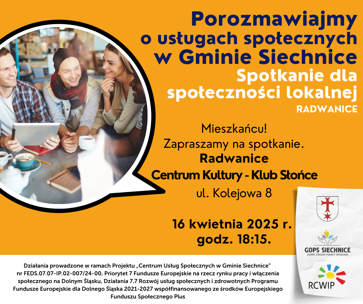 W najbliższą środę, 16.04.2025 o godzinie 18:15 serdecznie zapraszamy mieszkańców Gminy Siechnice, w szczególności mieszkańców Radwanic na ostatnie już spotkanie z cyklu "Porozmawiajmy o usługach społecznych w Gminie Siechnice" do Centrum Kultury - Klub Słońce, przy ulicy Kolejowej 8 w Radwanicach.
