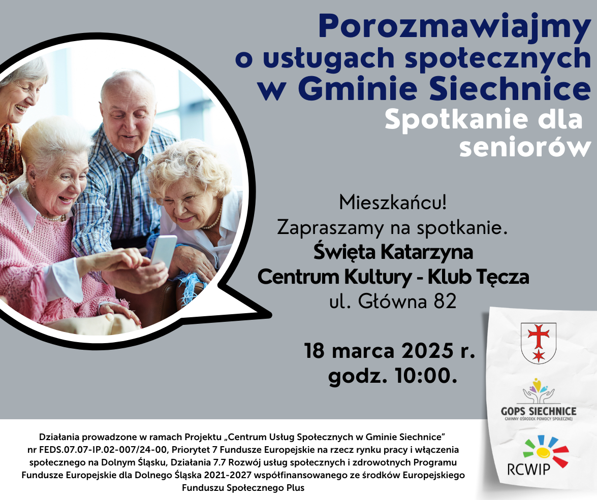 Już w najbliższy wtorek 18.03.2025 zapraszamy Seniorów mieszkających na terenie naszej gminy na spotkanie z cyklu "Porozmawiajmy o usługach społecznych w Gminie Siechnice".