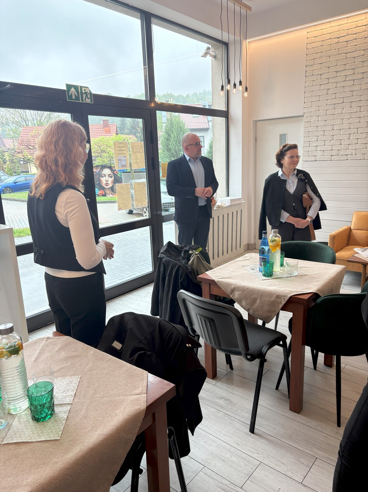 Zostaliśmy tam bardzo ciepło przyjęci przez pracowników CUS W Myślenicach, ale przede wszystkim przez członków Fundacji FOR EDU. Fundacja jest przedsiębiorstwem społecznym zatrudniającym osoby z niepełnosprawnościami. Kawa i ciasto przygotowane specjalnie na nasz przyjazd oraz podawane przez członków Fundacji smakowało wyśmienicie i lepiej niż w zwykłej kawiarni. Trzymamy kciuki za rozwój tego miejsca.