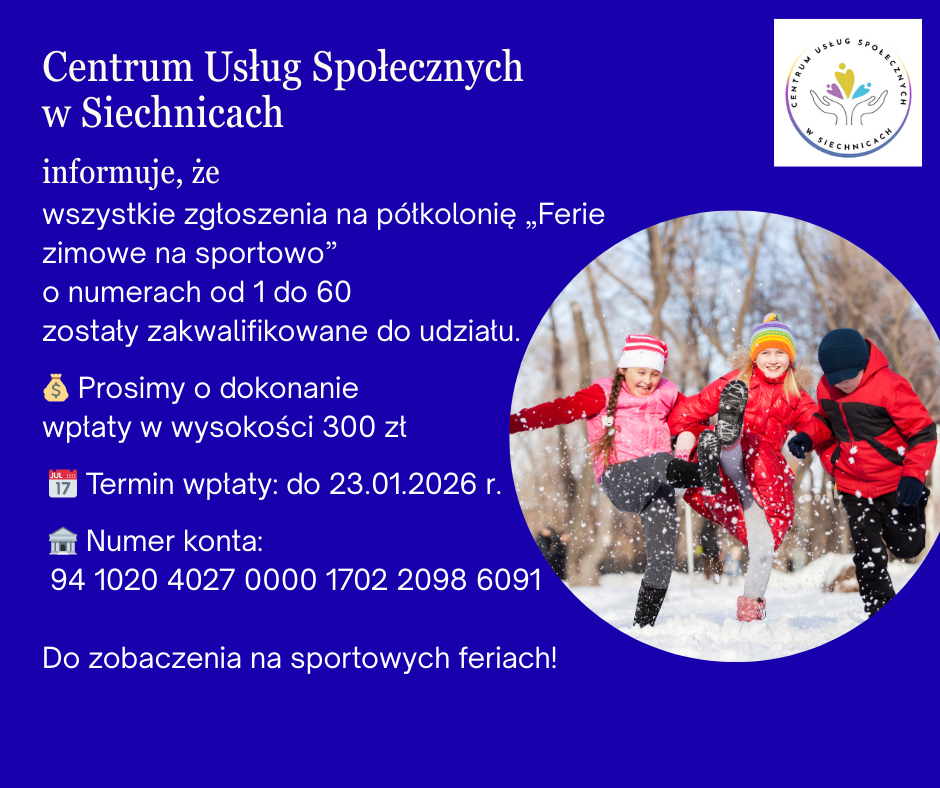 Informujemy, że wszystkie zgłoszenia na półkolonię „Ferie zimowe na sportowo” o numerach od 1 do 60 zostały zakwalifikowane do udziału.