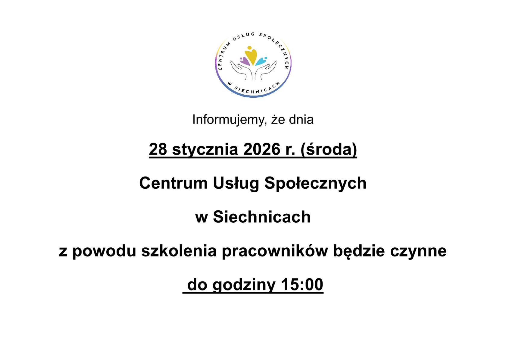 Informujemy, że w środę 28 stycznia 2026 r. Centrum Usług Społecznych w Siechnicach