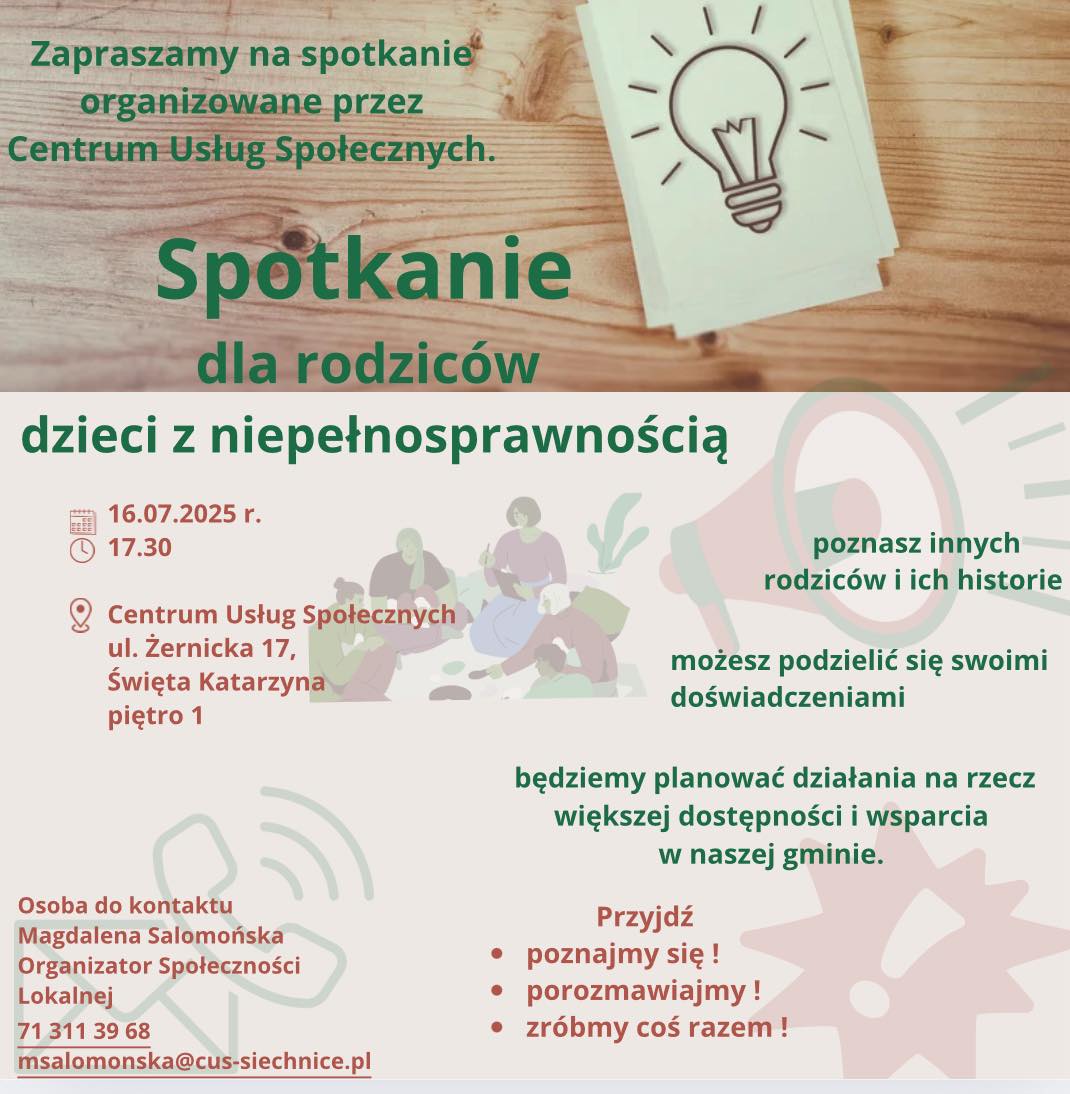 W dniu 16 lipca 2025r. o godzinie 17:30 w siedzicie Centrum, ul. Żernicka 17, Święta Katarzyna (I piętro) odbędzie się spotkanie dla rodziców dzieci z niepełnosprawnością. Celem spotkania jest integracja, wymiana doświadczeń i planowanie działań wspierających.