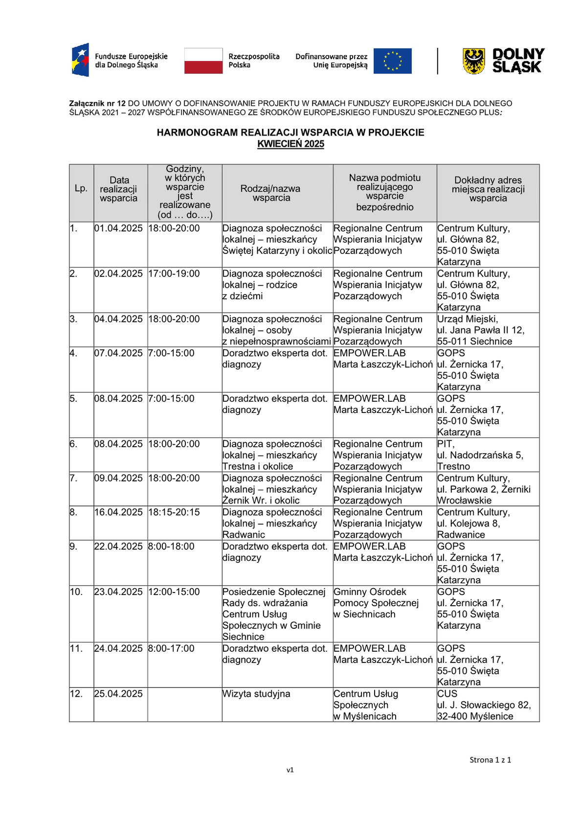 HARMONOGRAM REALIZACJI WSPARCIA W PROJEKCIE - KWIECIEŃ 2025