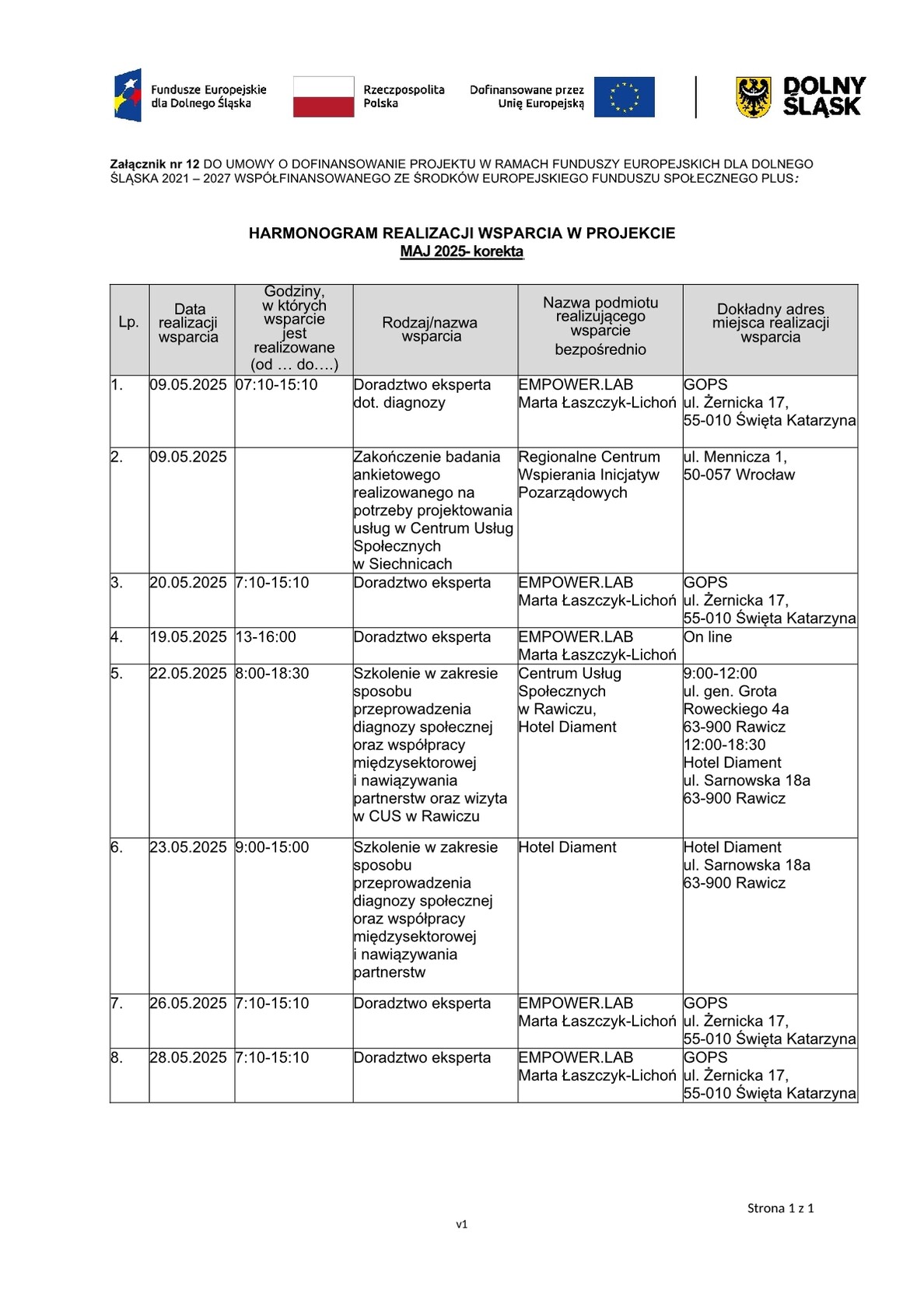 HARMONOGRAM REALIZACJI WSPARCIA W PROJEKCIE - MAJ 2025
