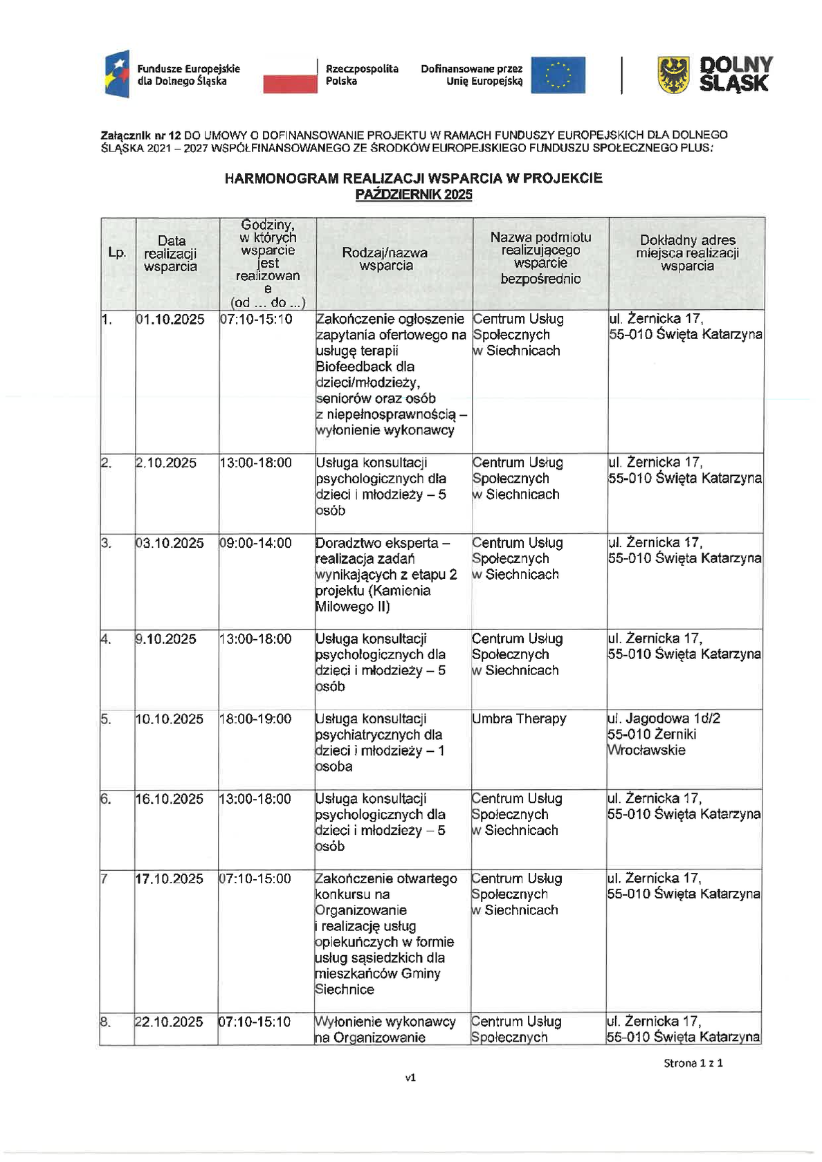 HARMONOGRAM REALIZACJI WSPARCIA W PROJEKCIE - PAŹDZIERNIK 2025