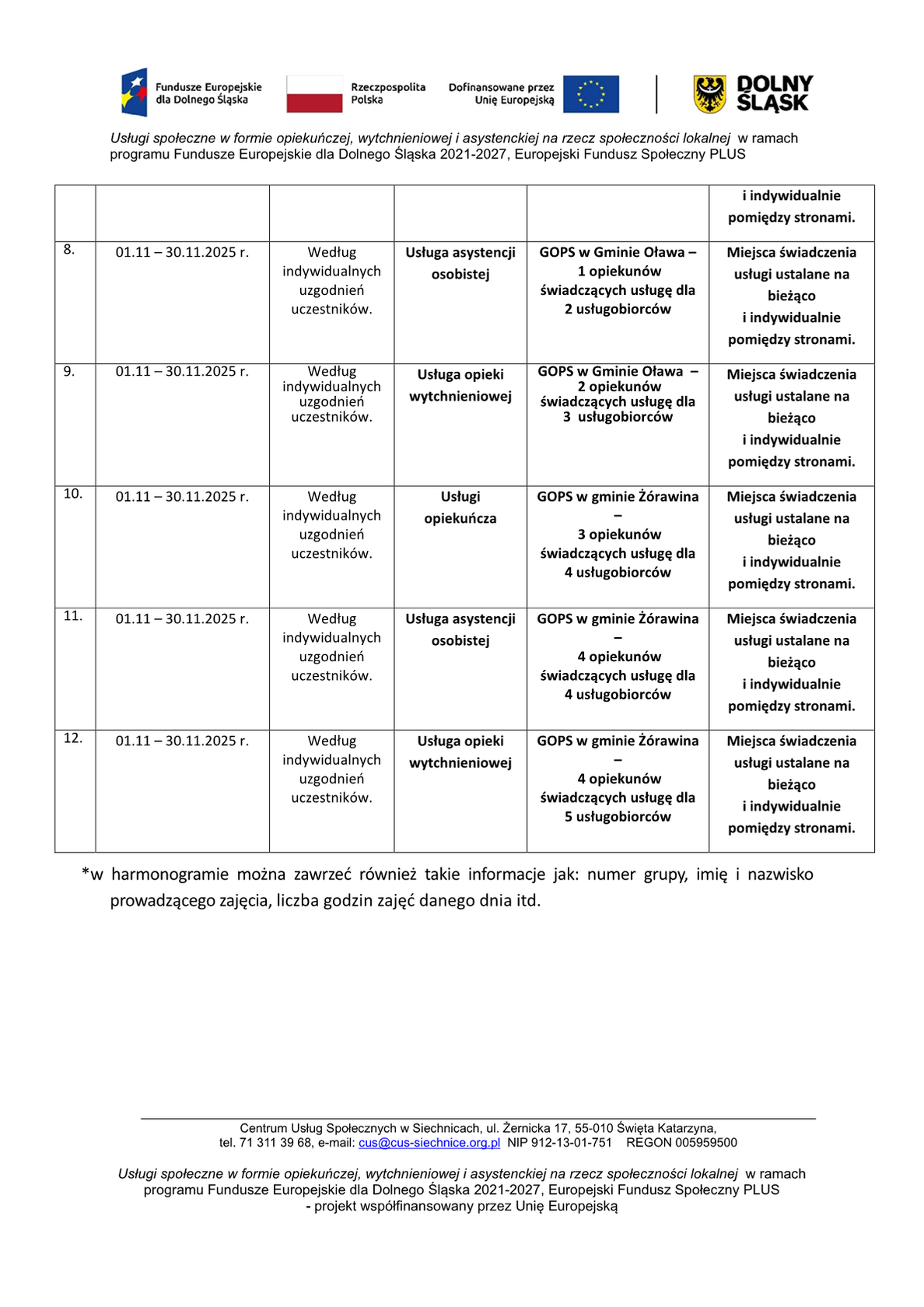 HARMONOGRAM REALIZACJI WSPARCIA W PROJEKCIE - LISTOPAD 2025