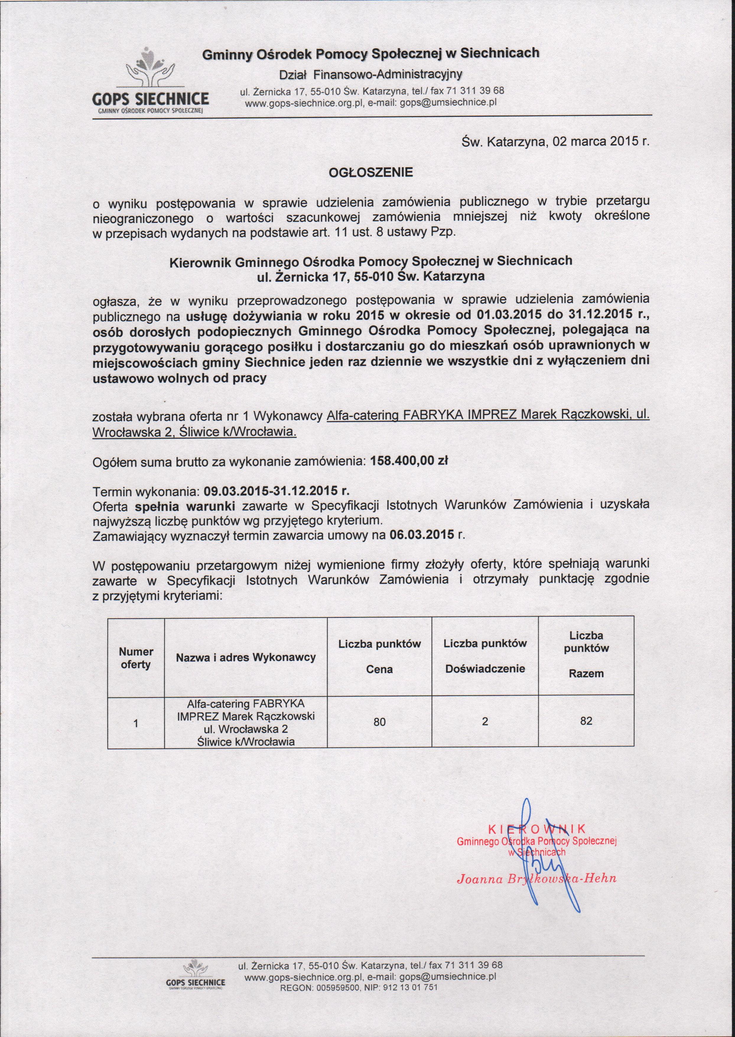 Niezbędne dokumenty do pobrania w ramce obok. Do pobrania Ogłoszenie SIWZ Załączniki nr 1-4 do SIWZ Załącznik nr 5 - Projekt umowy Ogłoszenie o wyniku postępowania Informacja o podpisaniu umowy